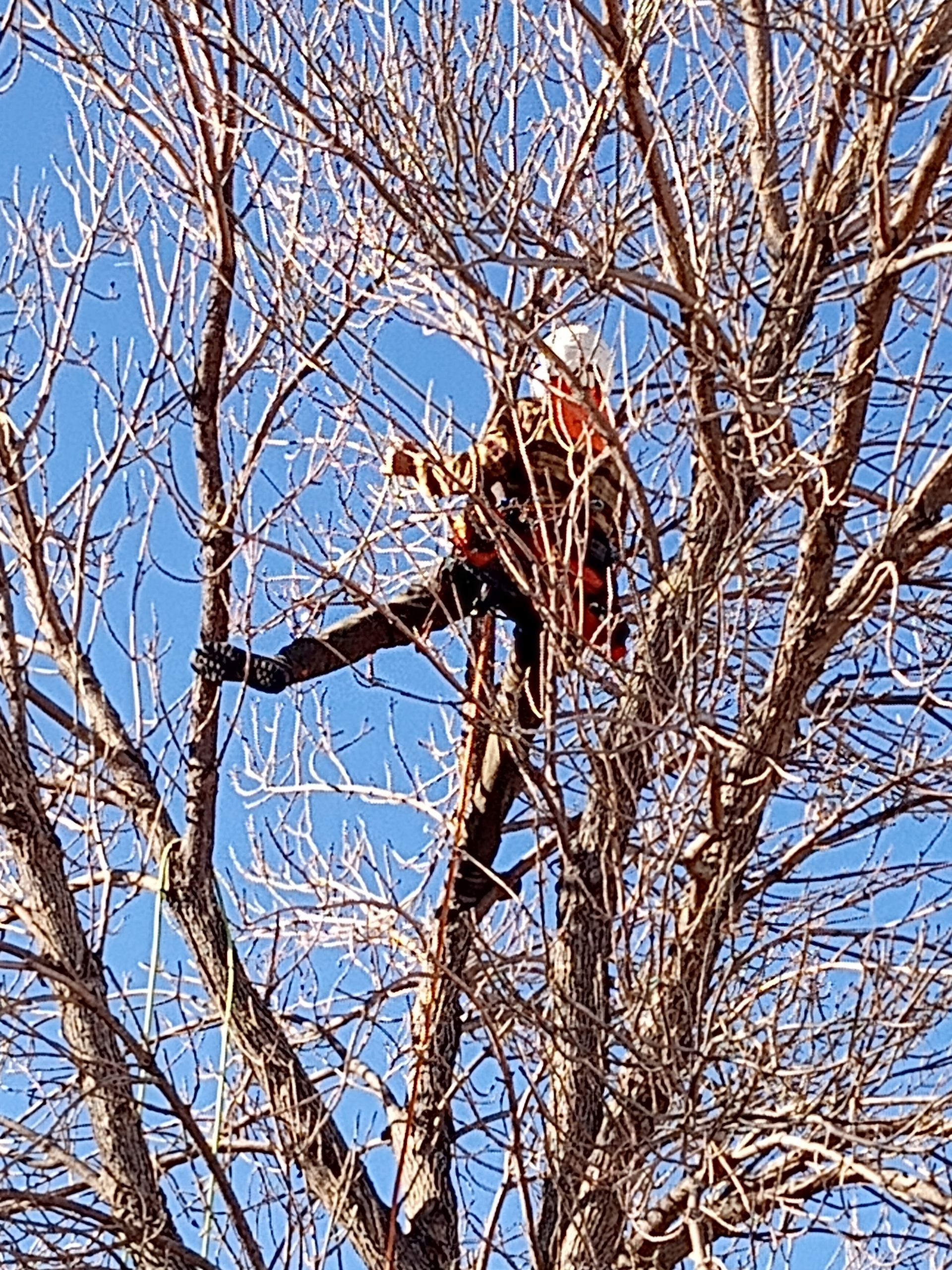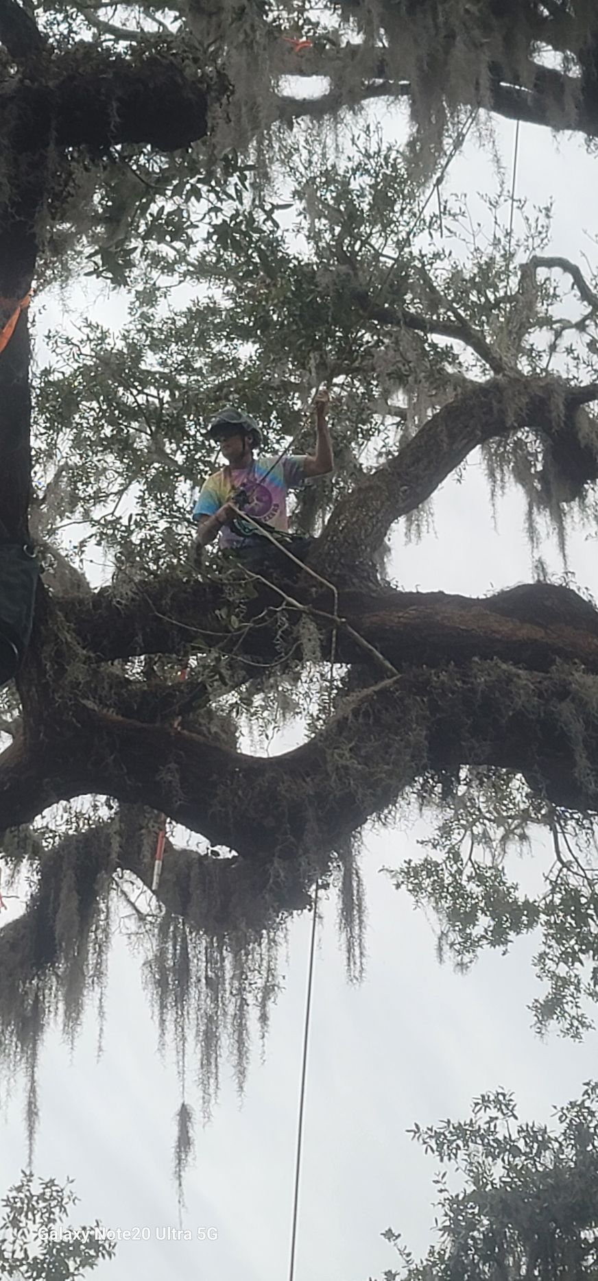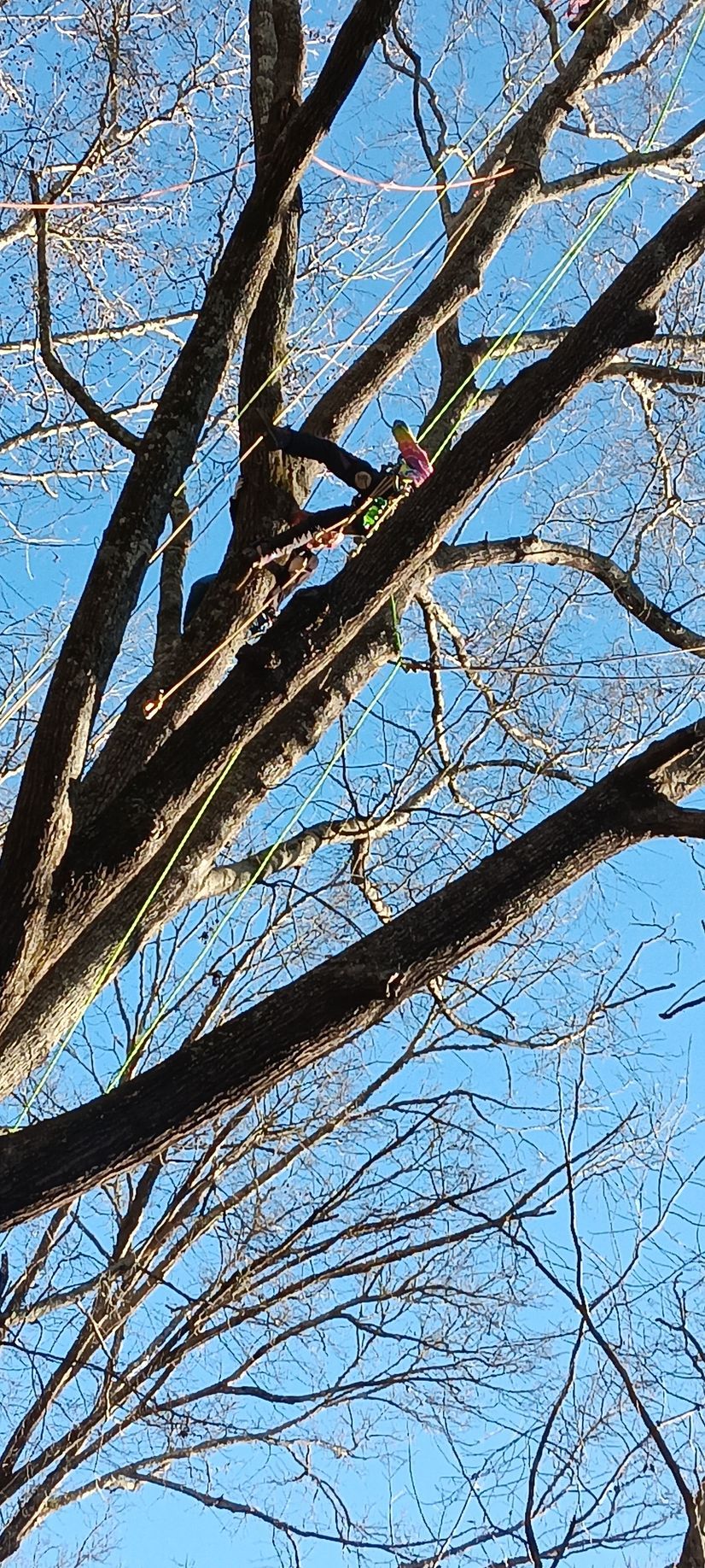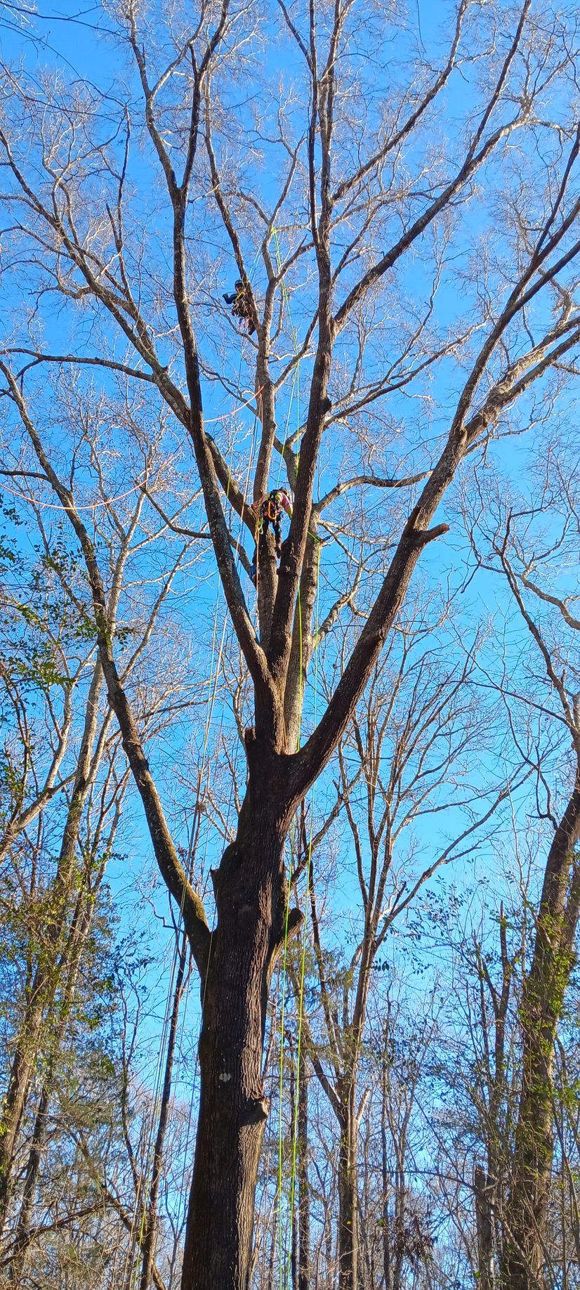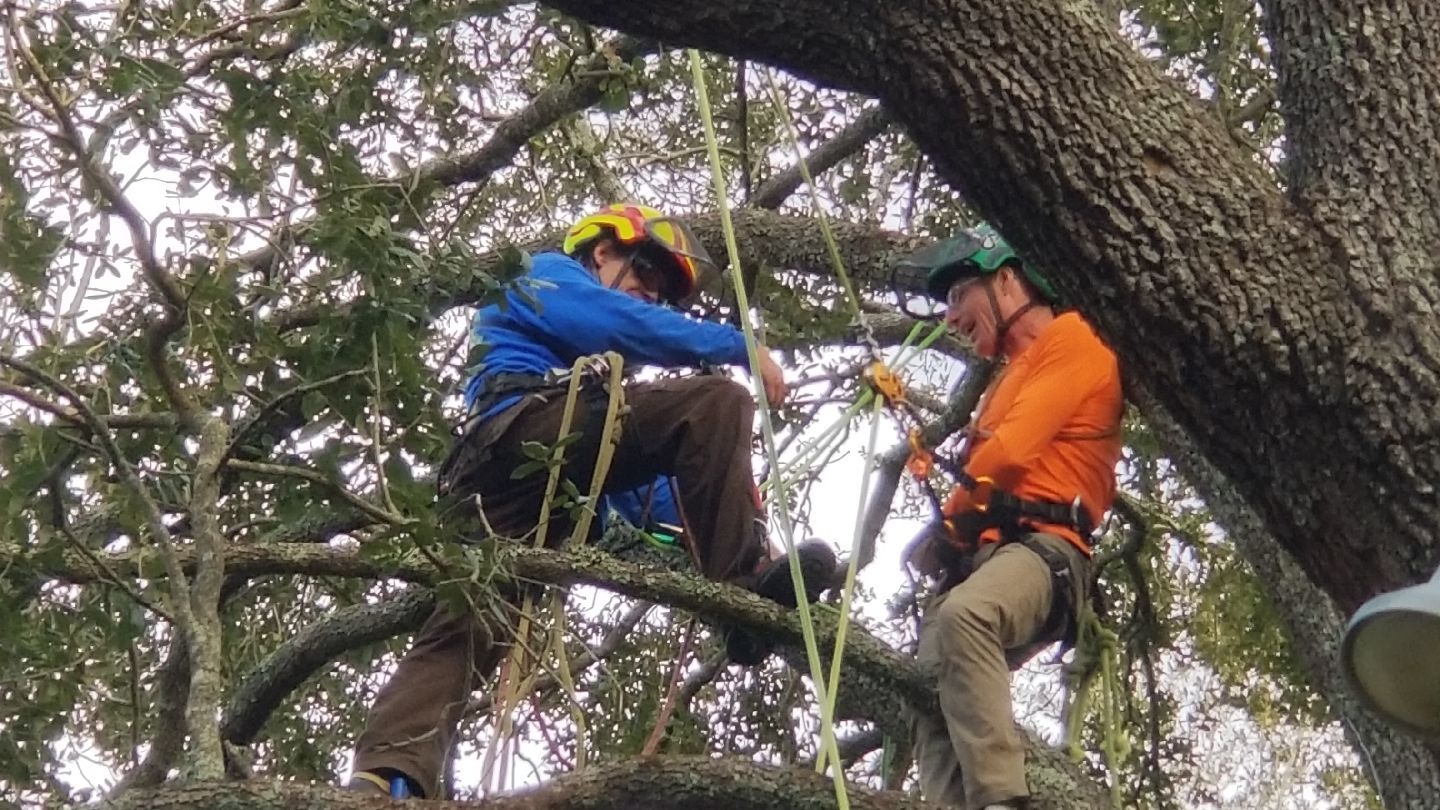 Bob the owner in a tree in GA for a rec climb teaching and learnig with other tree